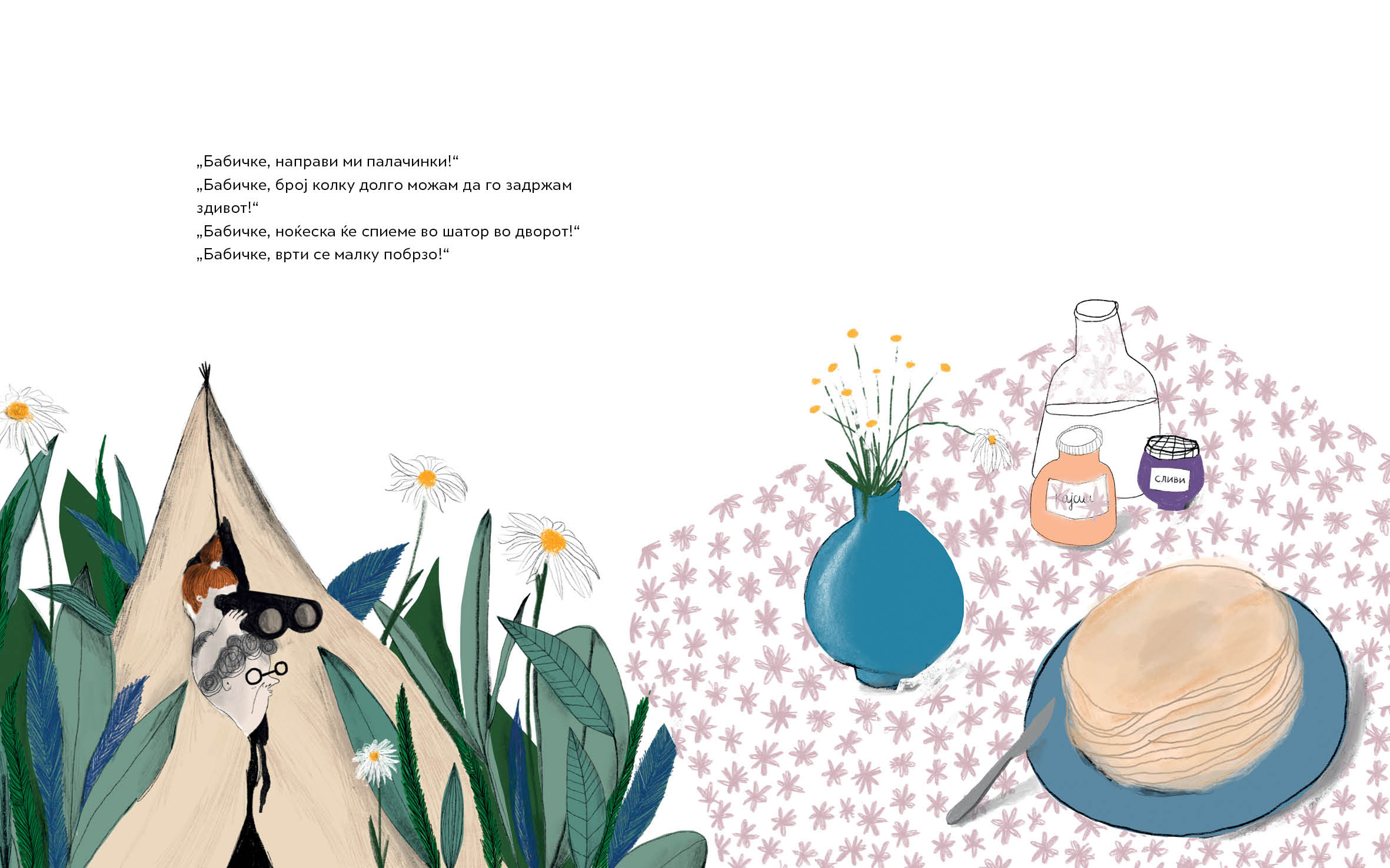 Приказната почнува со палачинки! Со кампување и шатор! Со возење велосипед и пливање со баба! Со игра! Бабата е портретирана е како семоќна во очите на својата внука, како полна со живот и страст, како жена за која нема нешто невозможно. Тоа е менталниот пресек во кој внуката се чувствува сигурно и заштитено. И тие двете (баба и внука) заедно прават куклени претстави, плетат волнени џемпери, цртаат стрипови, читаат приказни… сè до денот кога веќе не… Прекрасно е опишан процесот во кој бабата полека ја губи силата, физичката, но и менталната. Првин почнува да поставува необични прашања за тоа каде ѝ се очилата, како се вика сосетката, дали утрото го испила апчето и слични работи за кои не умее повеќе да се сети. Еден ден палачинките по грешка ги прави со сапуница наместо со масло, не знае да се врати дома со автобусот, не може сама да се закопча и облече… Целиот тој процес на обезмоќување на старицата е толку суптилно раскажан, а толку силно допира.