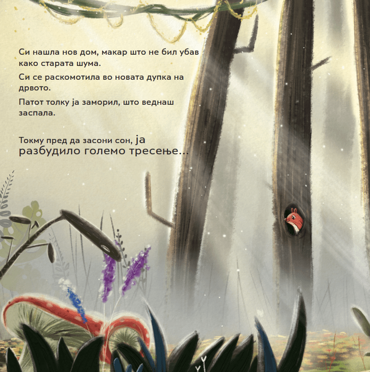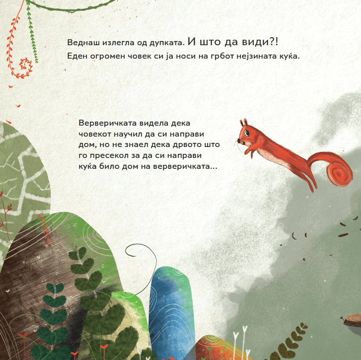 Прекрасна, едноставно раскажана приказна за една горлива тема во која секој од нас ќе се пронајде. Домот како симбол, нам ни е најчесто поврзан со изградена куќа, стан, простор во кој сме безбедни. Но, што кога домот на една верверичка, која природно живее во корите на шумските дрвја, е уништен?