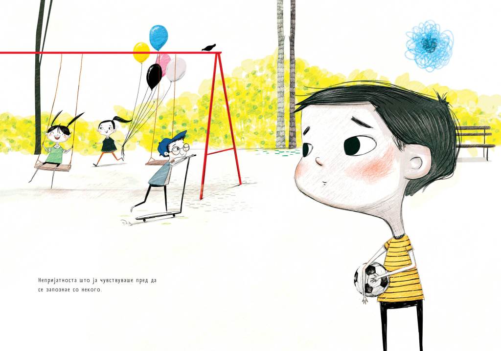 Али, едно навидум кревко човеченце нацртано со најслатките стапчиња ноџиња од илустраторката Ознур Сонмез, е дете кое ги „трупа“ своите стравови и срамови зад вратата од својата соба. Типично детско однесување низ книга, ќе си кажете. Претпоставувам дека како возрасни, како родители, се прашуваме/те како децата го доживуваат стравот: како голема баба рога со црвени очи во темнината, или како потсмев од другарчето во паркот кога ќе паднат и ќе си ги издраскаат коленцата?
